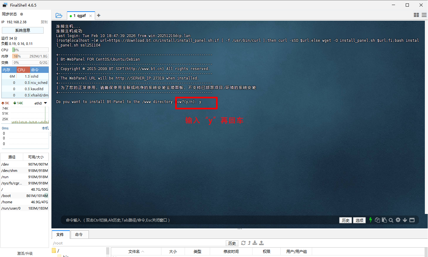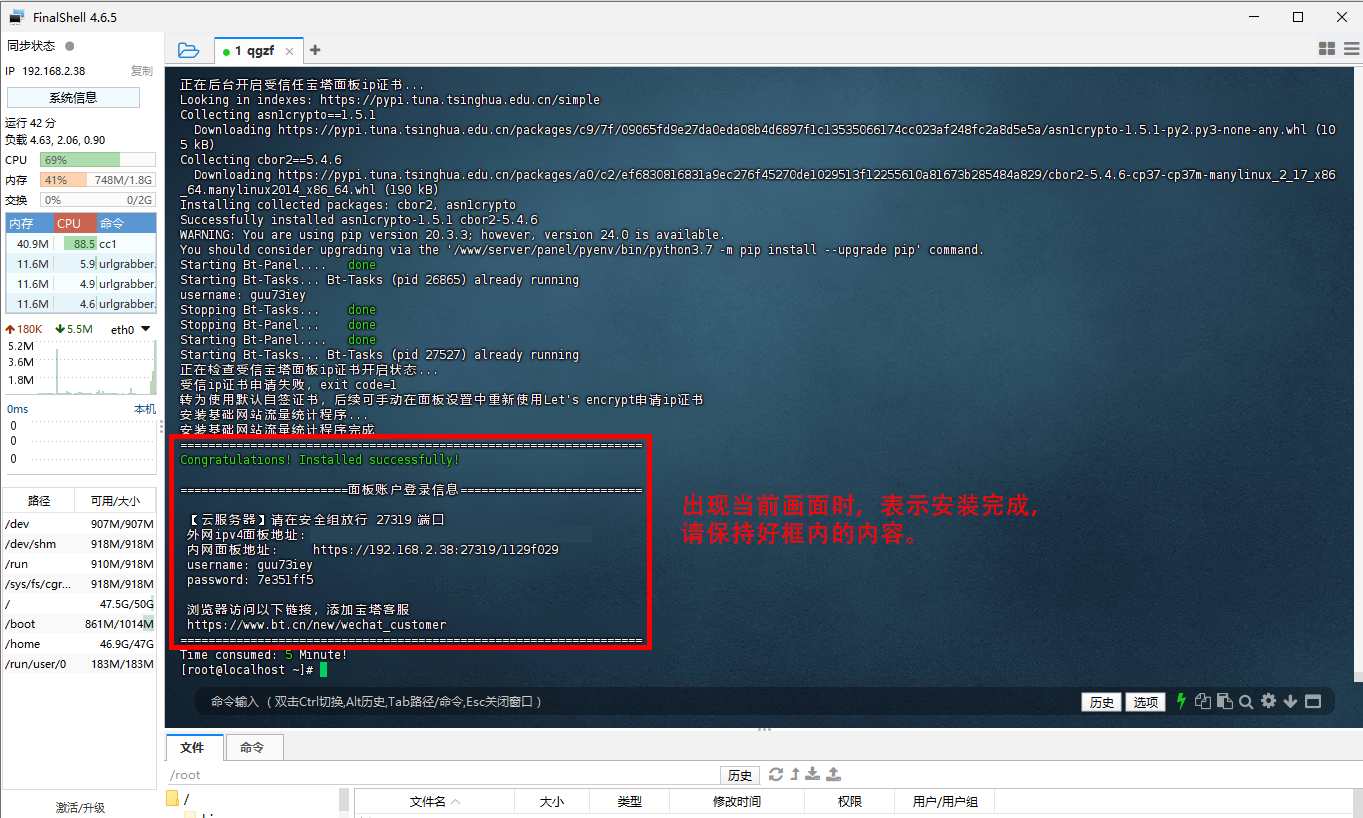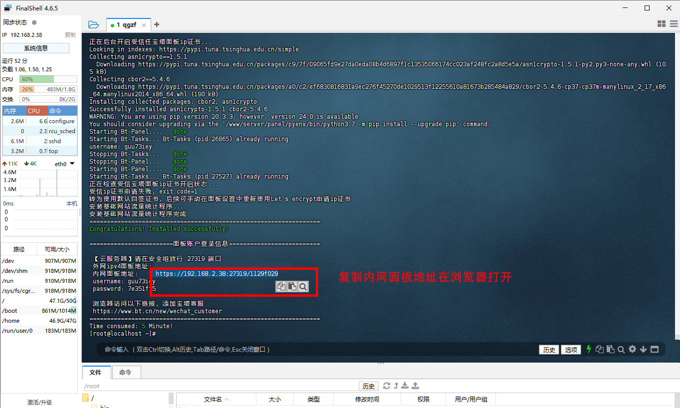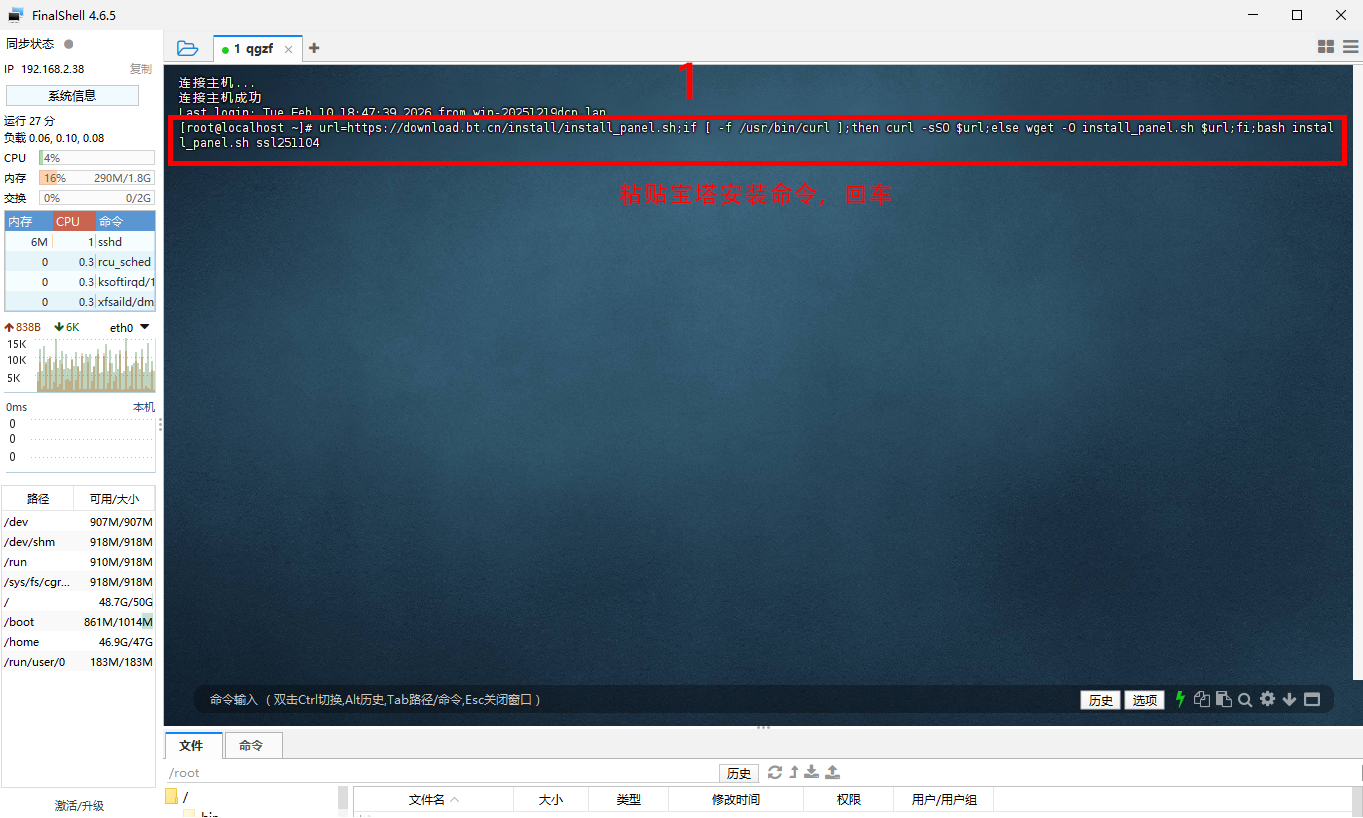 ## SSH工具安装与使用 FinalShell下载: https://www.hostbuf.com/t/988.html > >为了方便安装,接下来使用SSH工具来对虚拟机上的CentOS系统进行下一步部署 > --- ## SSH连接服务器设置 {width=908 height=540} --- {width=908 height=540} --- {width=908 height=540} --- {width=908 height=540} --- ## 安装宝塔面板 可以进入宝塔官网(https://www.bt.cn)获取最新版,可复制下面安装命令。 ``` url=https://download.bt.cn/install/install_panel.sh;if [ -f /usr/bin/curl ];then curl -sSO $url;else wget -O install_panel.sh $url;fi;bash install_panel.sh ssl251104 ``` {width=900 height=540} --- {width=900 height=540} --- {width=900 height=540} --- {width=900 height=540} --- {width=900 height=540} --- {width=900 height=540} --- {width=900 height=540} --- {width=900 height=540} --- {width=900 height=540} --- {width=900 height=540}